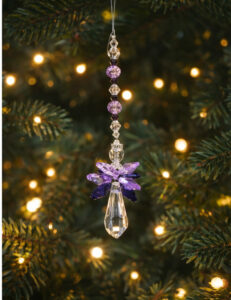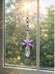 Suspendu près d’une fenêtre, il capte les rayons et les transforme en reflets irisés violets et blancs, en petits arcs-en-ciel et en éclats colorés qui viennent danser sur les murs au fil de la journée.