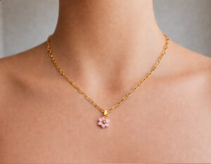 Ce collier se compose d’une chaîne fine au ton doré surmontée d’un pendentif en forme de fleur aux pétales roses. Son design minimaliste et délicat en fait un bijou facile à porter au quotidien tout en restant assez raffiné pour des occasions plus formelles. Le pendentif, de petite taille, capte la lumière sans être ostentatoire, offrant un équilibre parfait entre sobriété et charme.