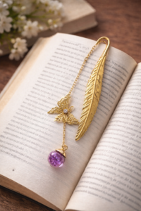Ajoutez une touche de poésie à vos lectures avec ce marque-page élégant au charme délicat. Sa plume dorée finement travaillée se glisse entre les pages avec légèreté, tandis que son papillon ajouré apporte une note raffinée et aérienne. En bas, un pendentif violet scintillant vient sublimer l’ensemble, comme un petit talisman qui accompagne vos moments de lecture.
